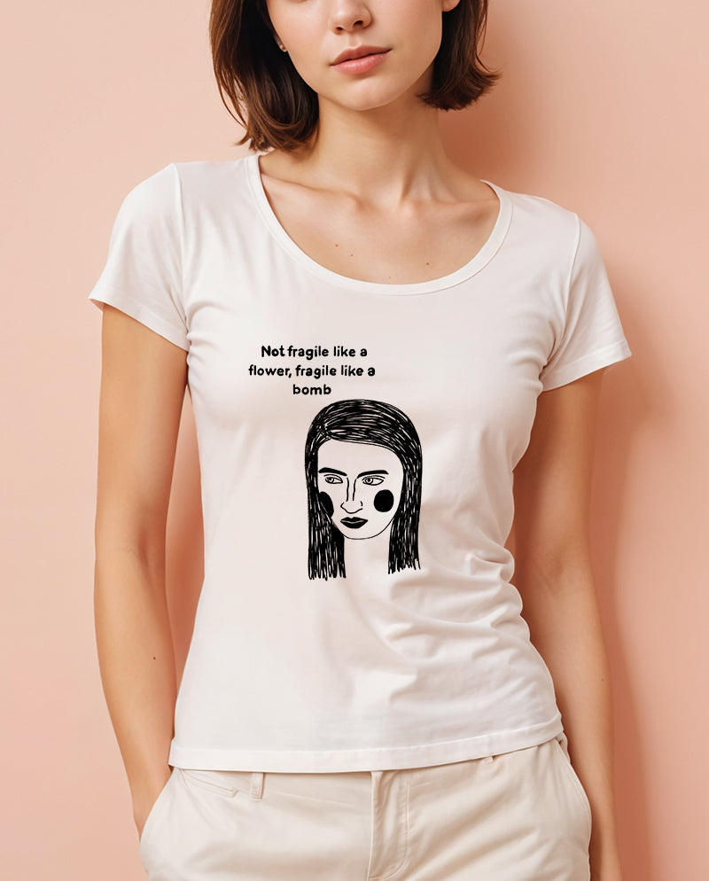 Gökçe Altunay’ın “Not fragile like a flower, fragile like a bomb” tasarımlı tişörtleri Anason İşleri’nde.