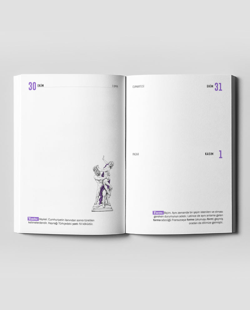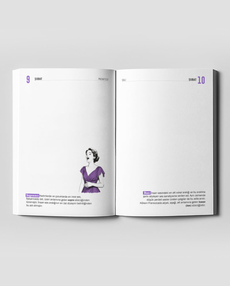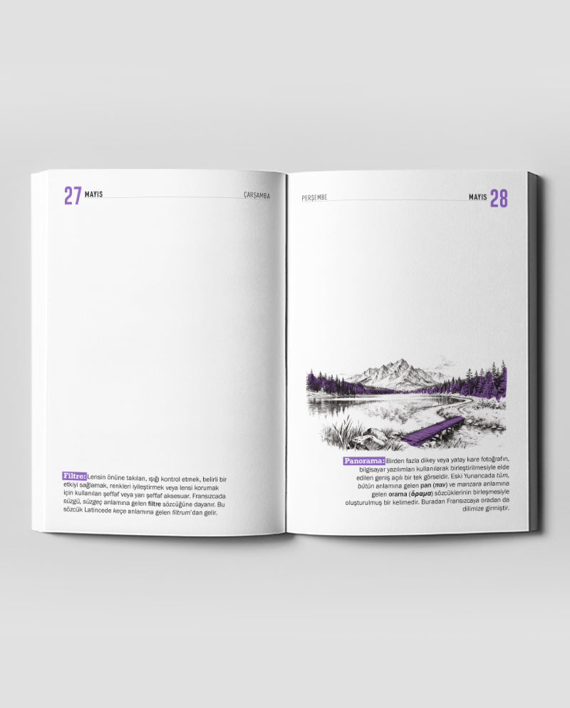 2025'in Kelimeli Ajanda'sından farklı olarak bu yıl her ay için bir başka sanat dalını konu başlığı seçtik. Ben o dallara dair kelimeler seçtim, onları günlere paylaştırıp tek tek açıkladım. Çok güzel desenlerle bezedik ve benim ısrarım üzerine, en sevdiğim renkte tasarladık, şimdi artık başka insanların hikâyelerini biriktirmek üzere bizden çıkıyor.
