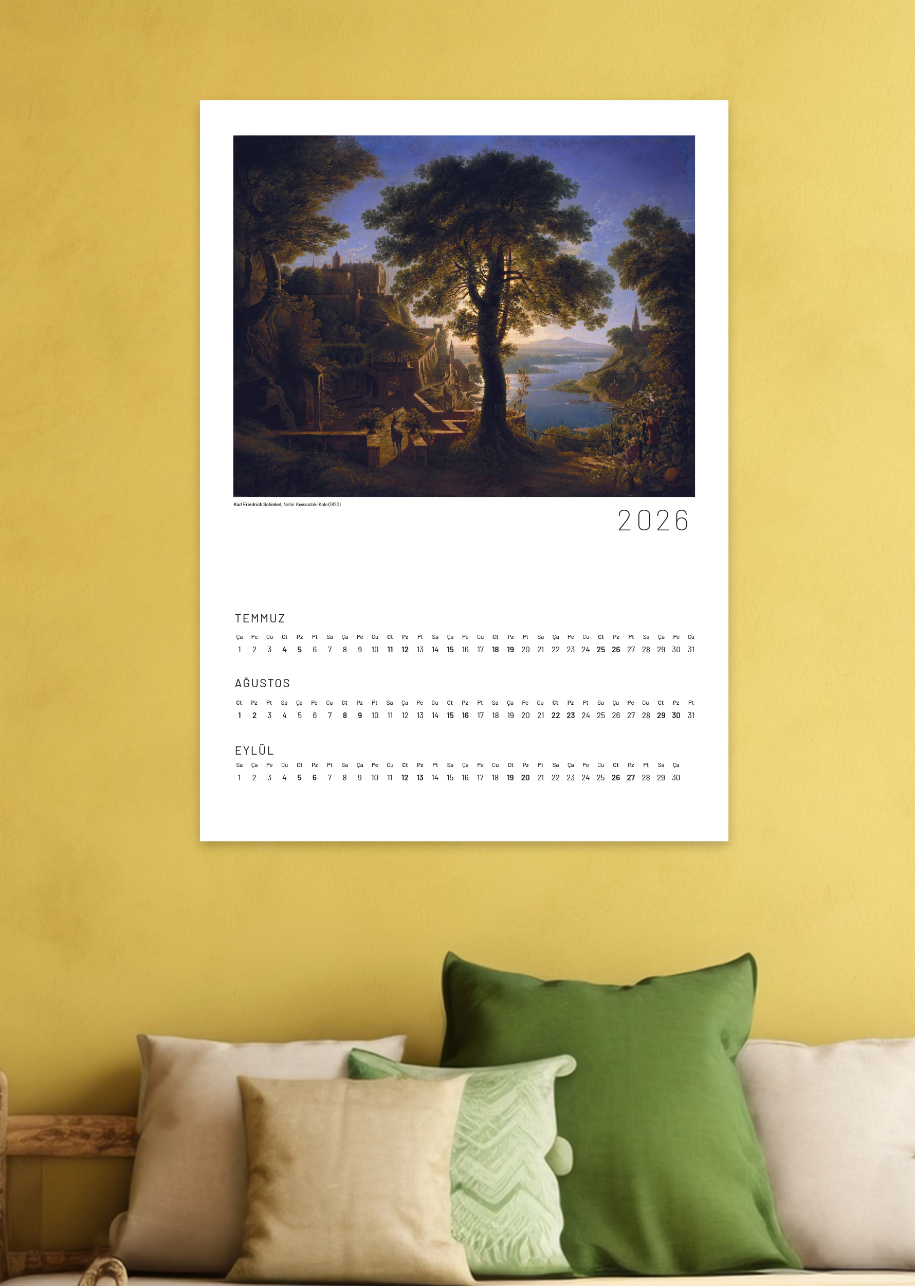 Prusya’nın devlet baş mimarlığını da yapan ressam Karl Friedrich Schinkel’in (1781-1841) tasarımları, çeşitli tarihi mimari tarzların yeniden canlandırılmasına dayanıyordu. Kendini neo klasik tarzda geliştiren Schinkel, günümüze ulaşan mimari eserleriyle de tanınıyor. 2026’da bu poster, duvarınızı sonbahara hazırlayacak.