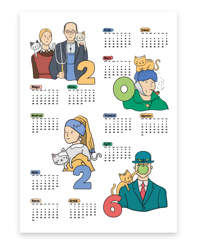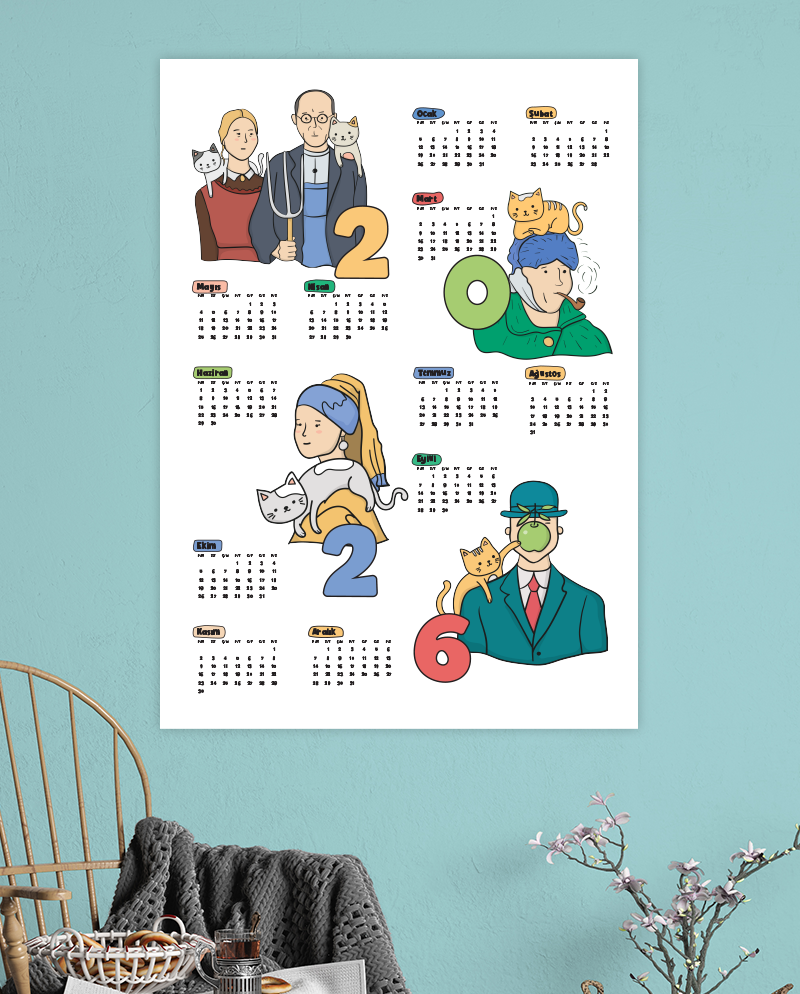 Sanat Miyavdır 2026 Takvimi, klasik eserleri kedilerin hükmü altına sokan eğlenceli bir duvar posteri. Meşhur tabloların içine dalmış bu patili karakterler, yıl boyunca her ayı daha keyifli, daha yaratıcı, daha gülümseten bir ritme bağlıyor. Hem sanatseverlere hem de kedi düşkünlerine ilaç gibi. Ozan Sezgin’in illüstrasyonlarıyla Nurcan Baş tasarladı.