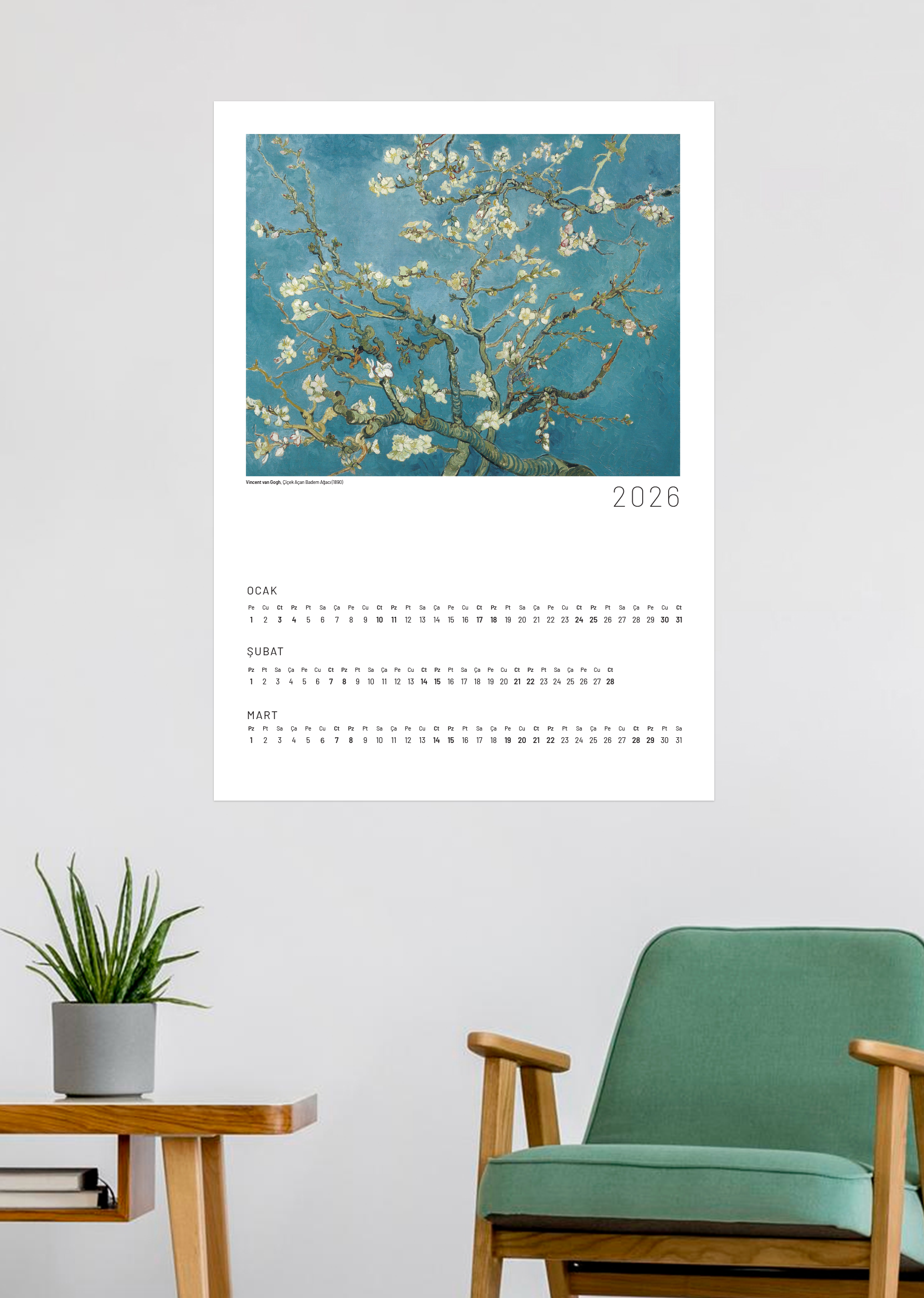 Van Gogh’un badem çiçekleri, 2026’ya hafif bir esintiyle giriyor. Mavi zemin üzerindeki zarif dallar hem taze hem dingin bir enerji taşıyor. Duvarınıza asınca mevsim değişmese bile içinizde minik bir bahar açıyor.