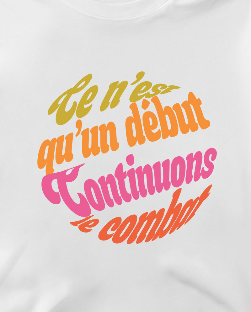 Fransızlar politik slogan konusunda oldukça yaratıcı ve dünya politik slogan tarihine geçen işlere imza atmış bir halk. “Bu daha başlangıç, mücadeleye devam!” da her dilde karşılığını bulmuş bir slogan. Orijinal dilinde bir tasarım yapalım dedik. Tavrını tarzına yansıtanlar için