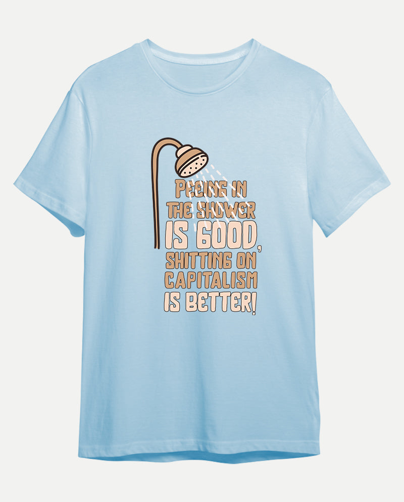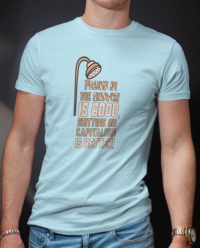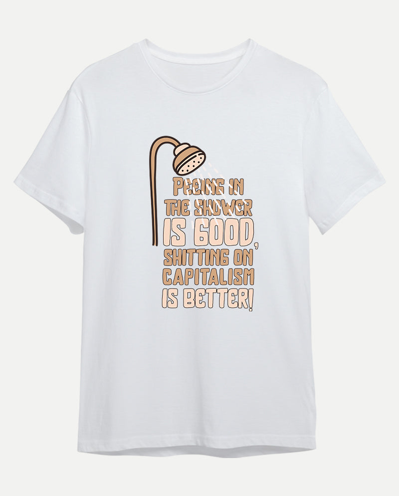 Eskilerin kullandığı bir kalıp vardır: “Çarkına s*çayım”. Buradaki çark, muhtemelen düzen, yapı anlamına geliyor. Düzenini bozarım ya da böyle düzeni bozayım gibi düşünülebilir. Duşta işemek meselesi de malum, herkes yapar, kimse yaptığını söylemez. Kapitalizmin çarkına etmek isteyenler, böyle düzeni bozmaya niyetlenenler ve duşta işemeyi sevip gizlemeyenler için hem politik hem mizahi, mis gibi tasarım tişört.