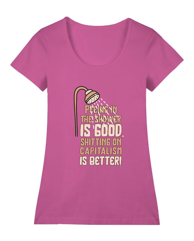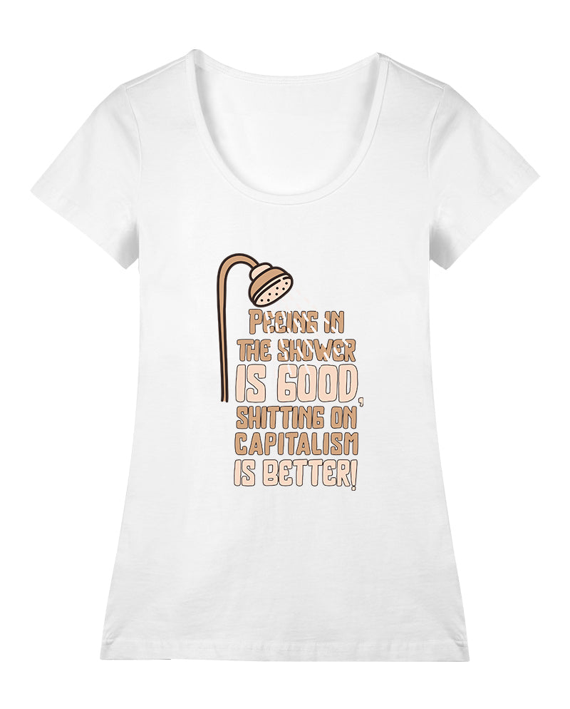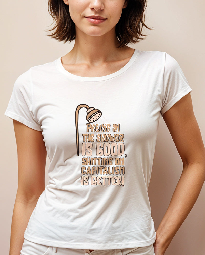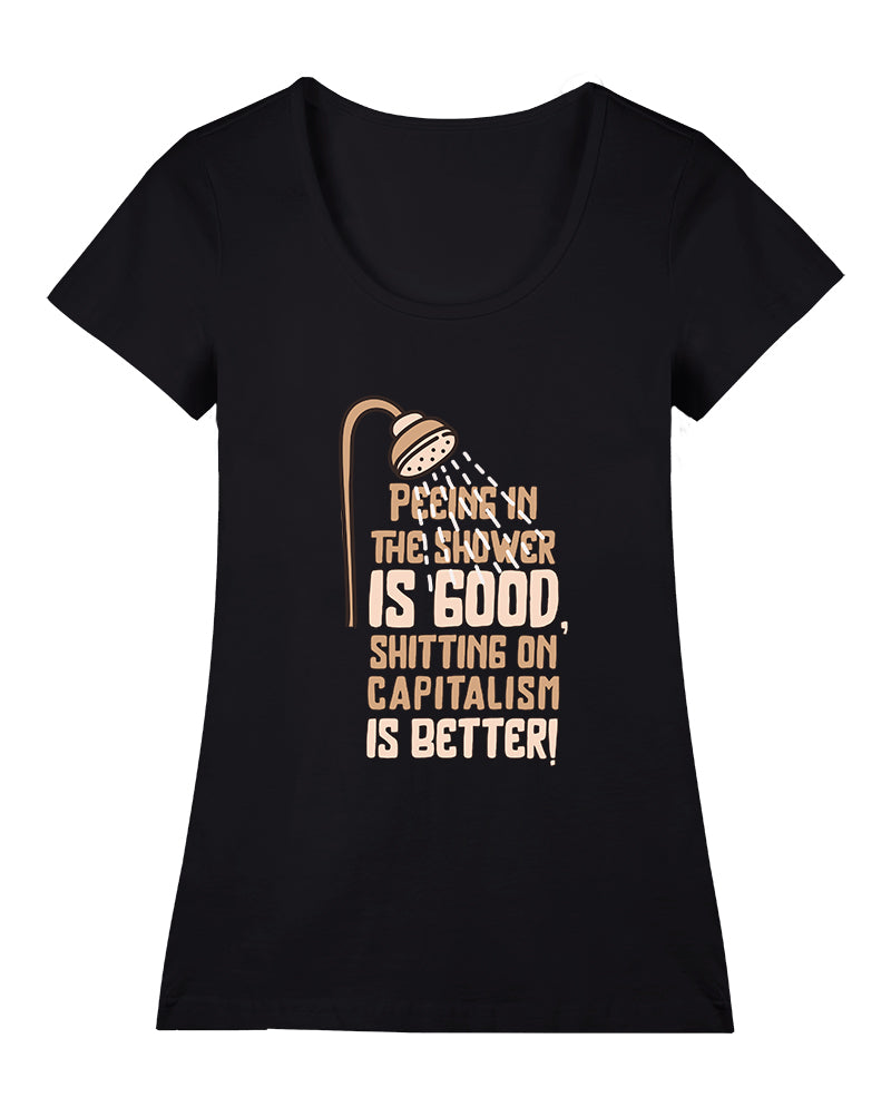 Eskilerin kullandığı bir kalıp vardır: “Çarkına s*çayım”. Buradaki çark, muhtemelen düzen, yapı anlamına geliyor. Düzenini bozarım ya da böyle düzeni bozayım gibi düşünülebilir. Duşta işemek meselesi de malum, herkes yapar, kimse yaptığını söylemez. Kapitalizmin çarkına etmek isteyenler, böyle düzeni bozmaya niyetlenenler ve duşta işemeyi sevip gizlemeyenler için hem politik hem mizahi, mis gibi tasarım tişört.